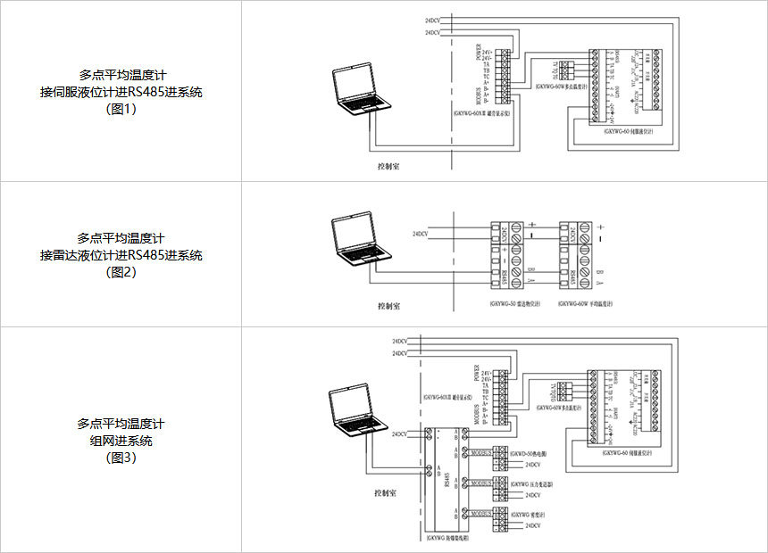 GKYWG-60W多點(diǎn)平均溫度計(jì)采用多點(diǎn)測(cè)溫原理,測(cè)量化工儲(chǔ)罐不同高度點(diǎn)的多個(gè)溫度值,實(shí)現(xiàn)液面上溫度、液面下溫度、平均溫度等值通過RS485 MODBUS協(xié)議或RTU方式進(jìn)控制室PLC或DCS系統(tǒng),實(shí)現(xiàn)多溫度參數(shù)監(jiān)測(cè)控制儲(chǔ)罐設(shè)備溫度,可以與伺服液位計(jì)、雷達(dá)液位計(jì)連接遠(yuǎn)傳至控制室系統(tǒng)。